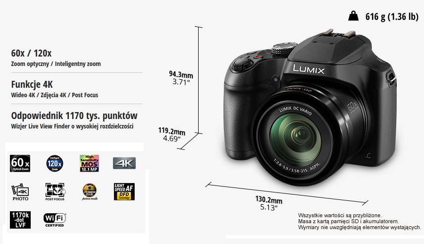 Real Foto! Panasonic Lumix DC-FZ82 4K Stan zużycia: 3* Gwarancja 3 miesiące Widoczne, ale normalne ślady używania, lekkie otarcia lub rysy na obudowie.